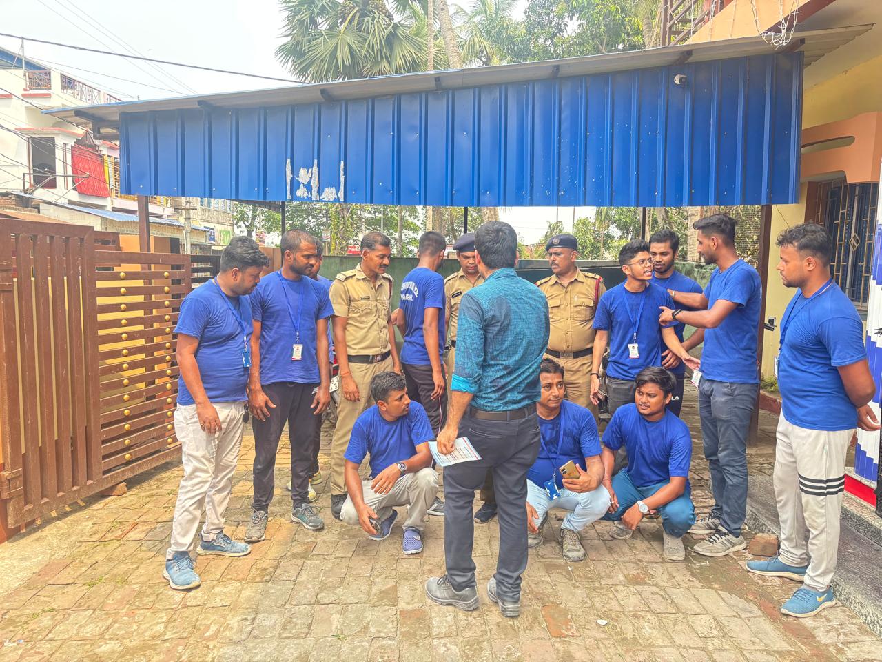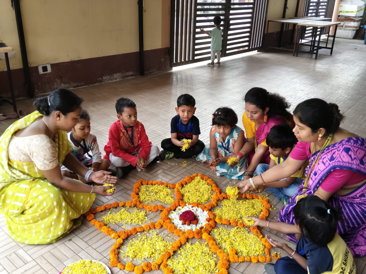 STUDENTS AND TEACHERS ARE DOING RANGOLI WITH FLOWERS.
