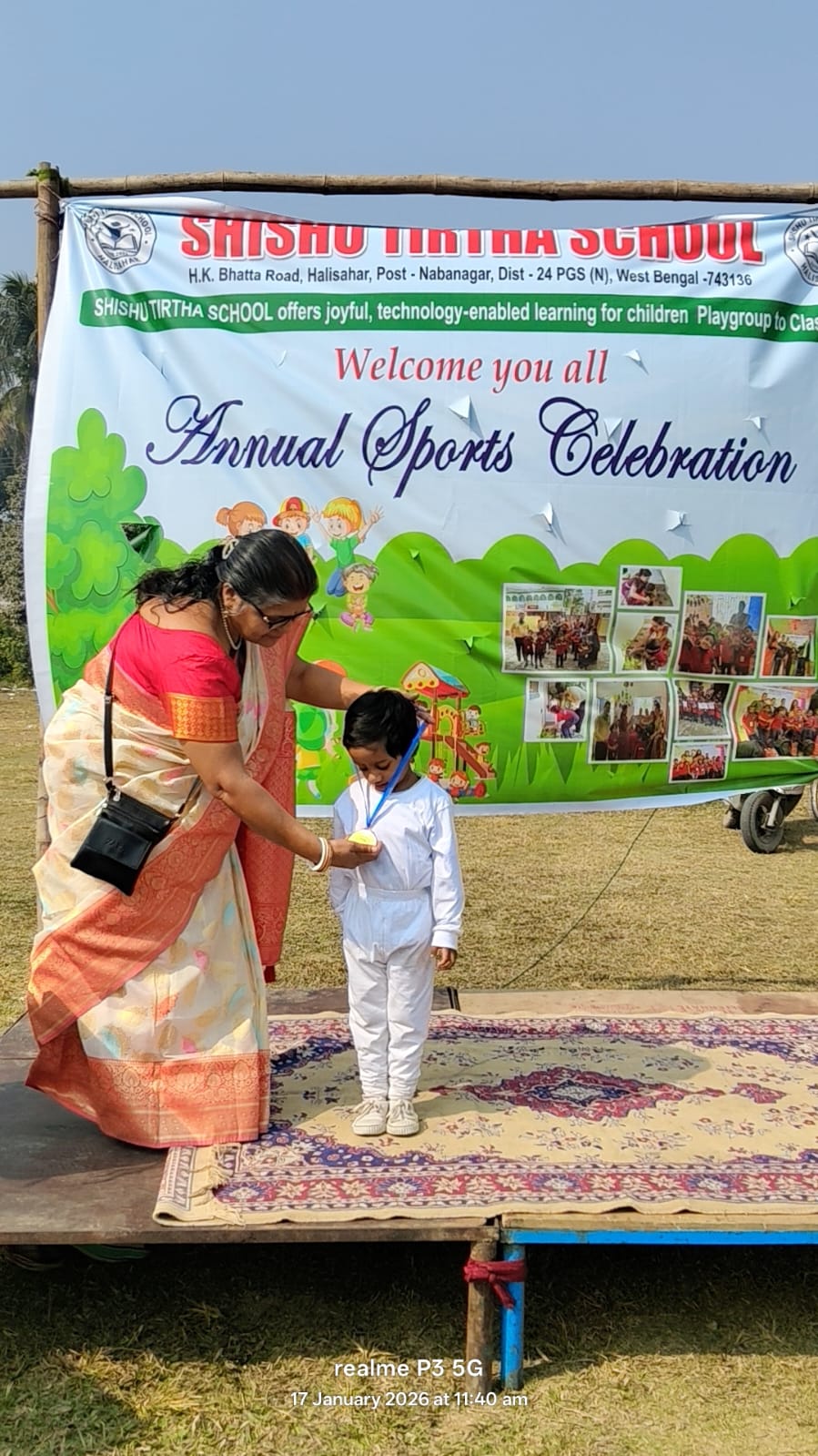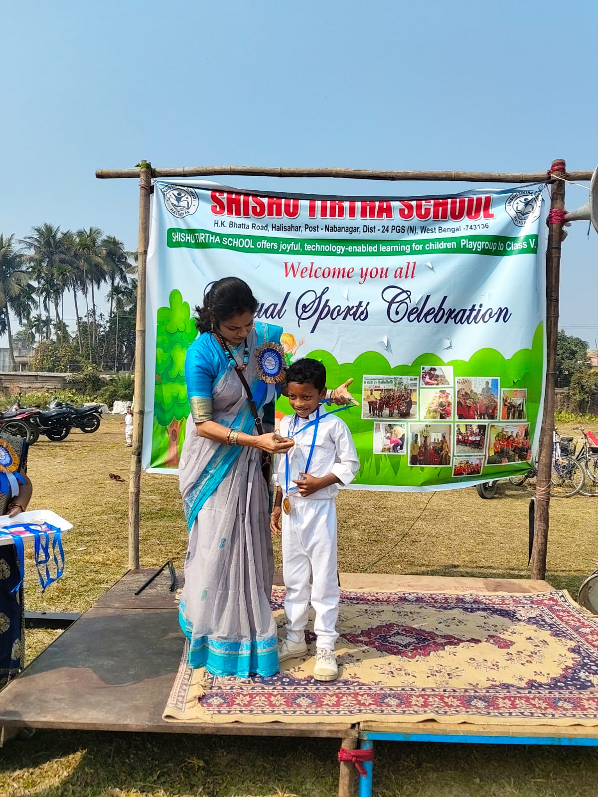 PRINCIPAL IS GIVING MEDAL IN OUR ANNUAL SPORTS DAY.